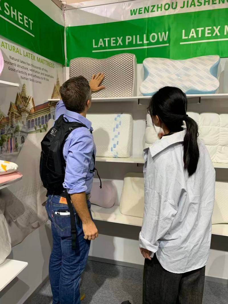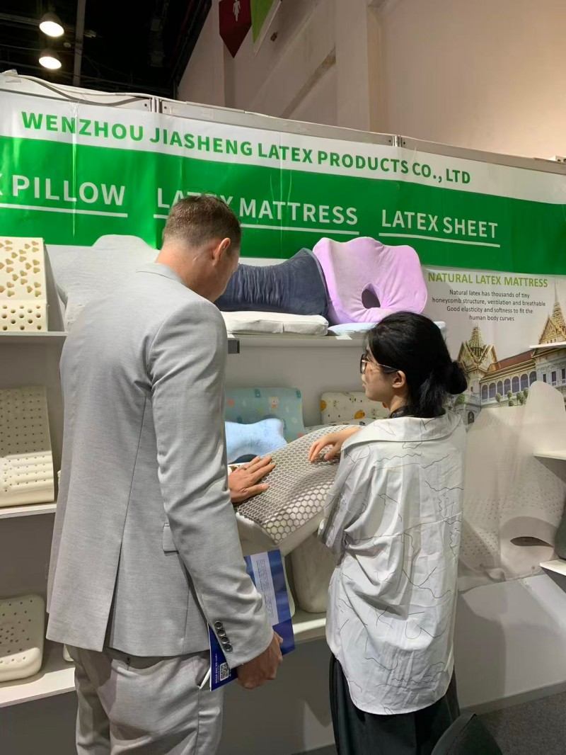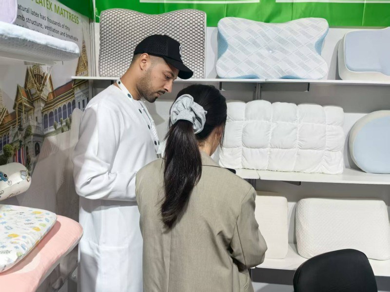 На овој изложби спавања у Дубаију, част нам је да посетиоцима из целог света покажемо наше јастуке усмерене на спавање. Посвећени смо представљању два најпродаванија јастука на тржишту:јастук од природног латексаи савремени паметни материјалјастук од меморијске пене. Заљубљеници у латекс веома воле брза повратна својства и антиалергијска својства латекса. У међувремену, врхунска меморијска пена може да обезбеди дубок сан. Наша детаљна комуникација са купцима на лицу места учинила је да осетимо њихову потеру за јастуцима. Чврсто верујемо да је пружање персонализованих избора за различите навике спавања кључ за квалитетан сан.